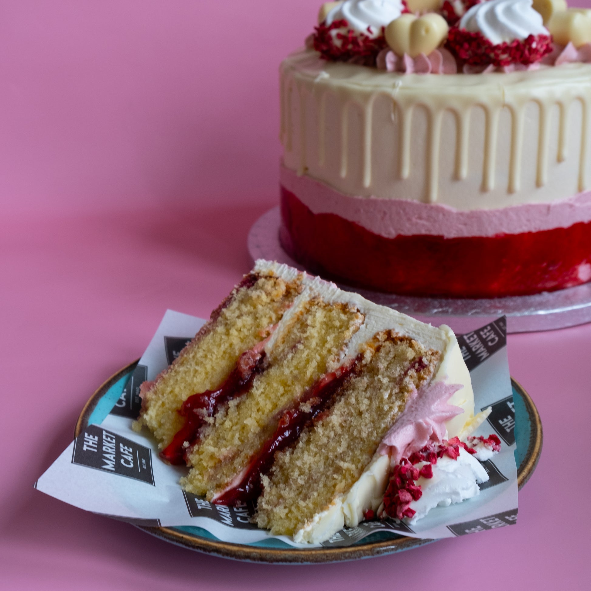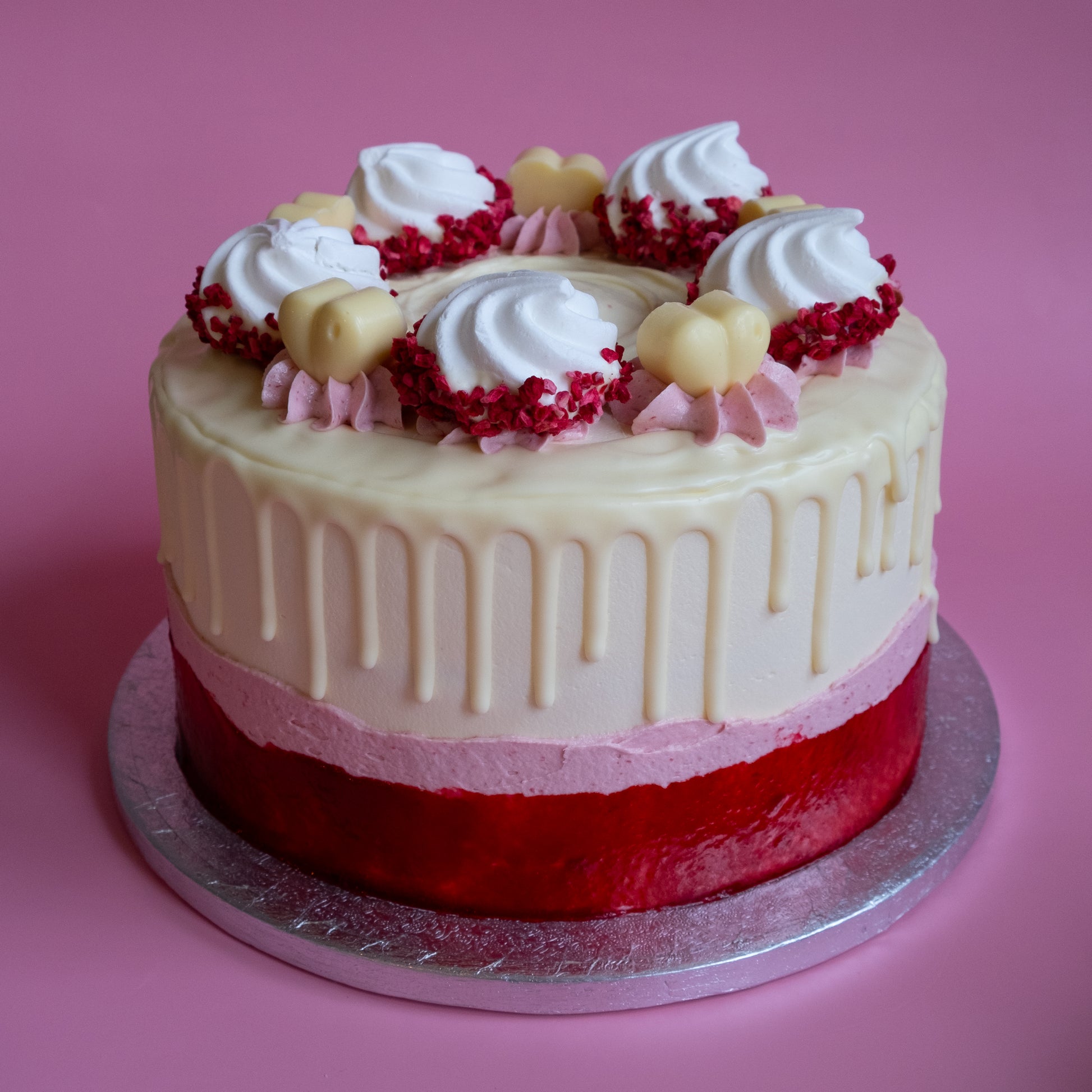 3 layers of raspberry ripple vanilla sponge, filled with white chocolate flavoured buttercream and raspberry jam. Decorated with mini meringues dipped in white chocolate and freeze dried raspberries, white chocolate hearts, a white chocolate drip, raspberry flavoured buttercream and raspberry jam.